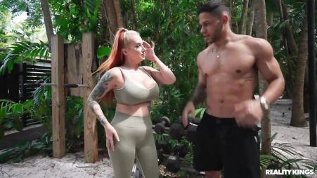The milf with big breasts knew a lot about sports and could give good advice. And today a beefy guy asked her to help during his workout. In the fresh air, together they had such a sex workout that they were both delighted. An experienced bitch with big milkings gave a great blowjob to a pumped-up guy to get him ready for sex training. When the busty woman sucked the trunk and took off her tights, she immediately found herself riding on a strong dick and began to enjoy herself in the cowgirl position with moans.